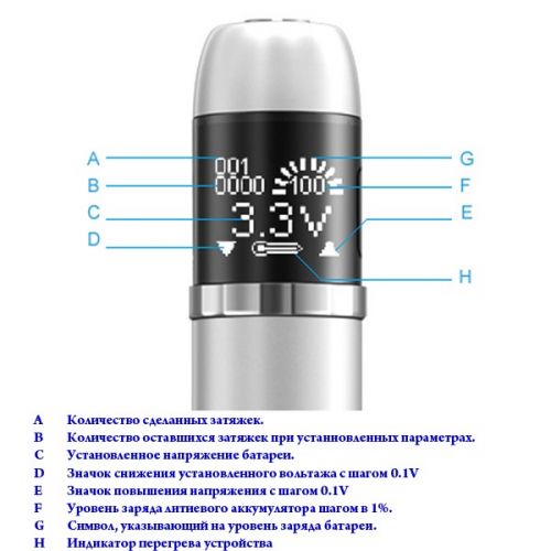 4. Возможность в любой момент проверить состояние атомайзера (текущее сопротивление или наличие проблемы соединения), контролировать уровень заряда аккумулятора и текущую температуру устройства.